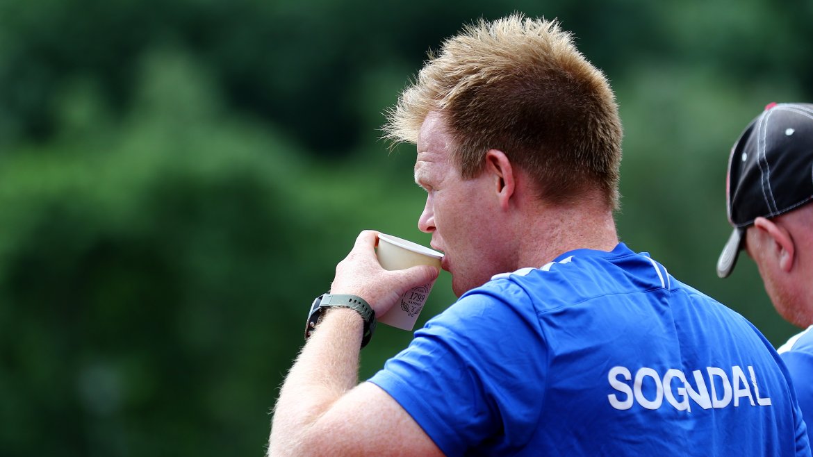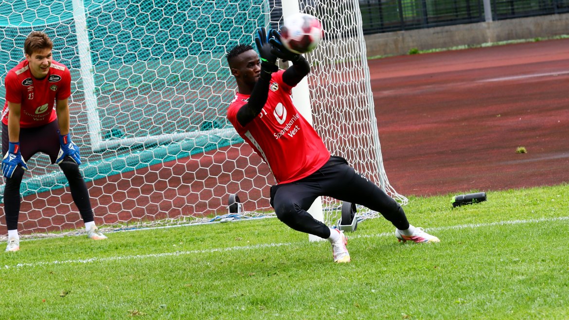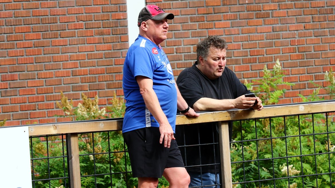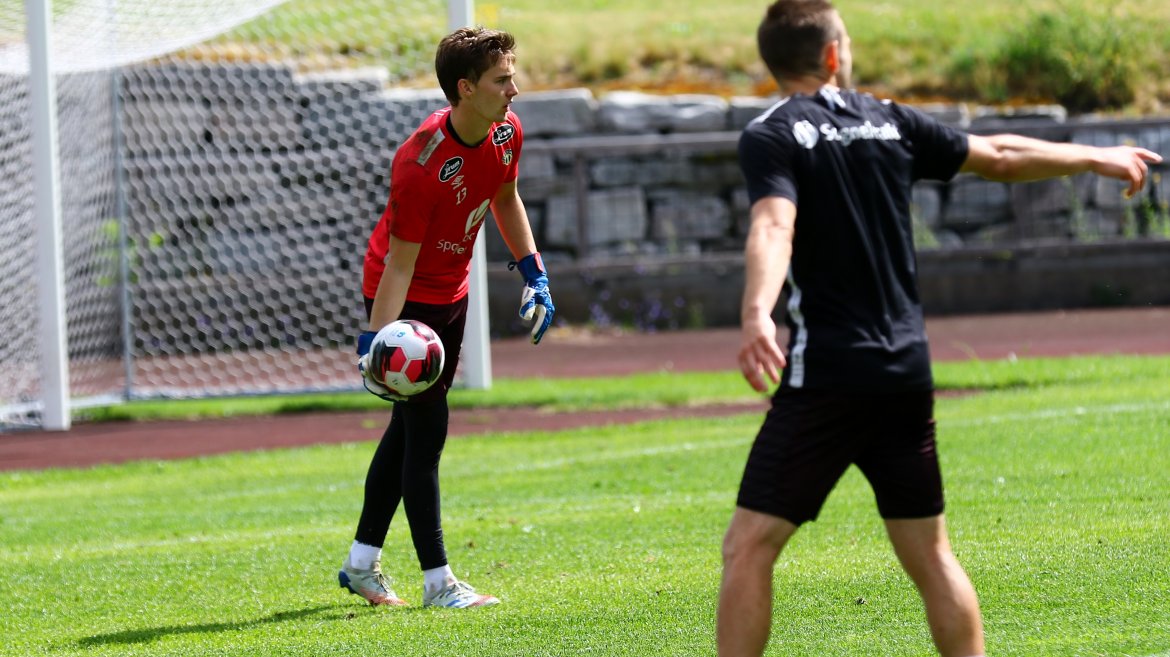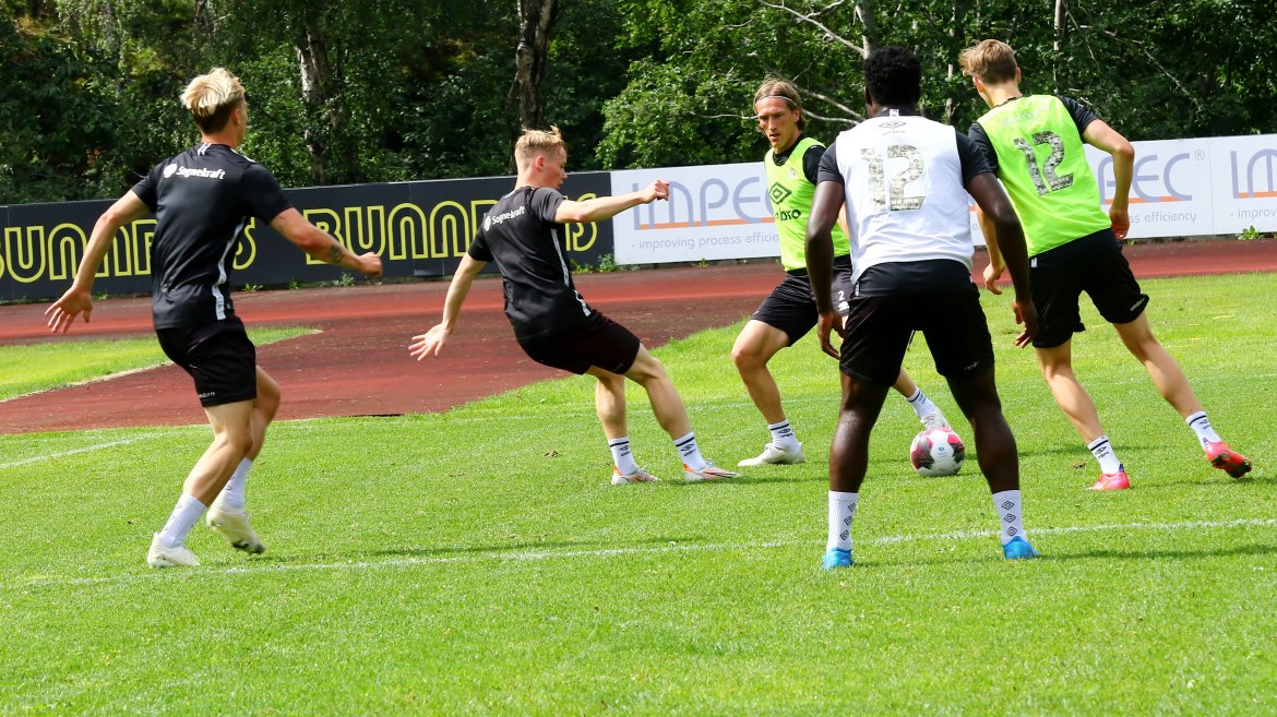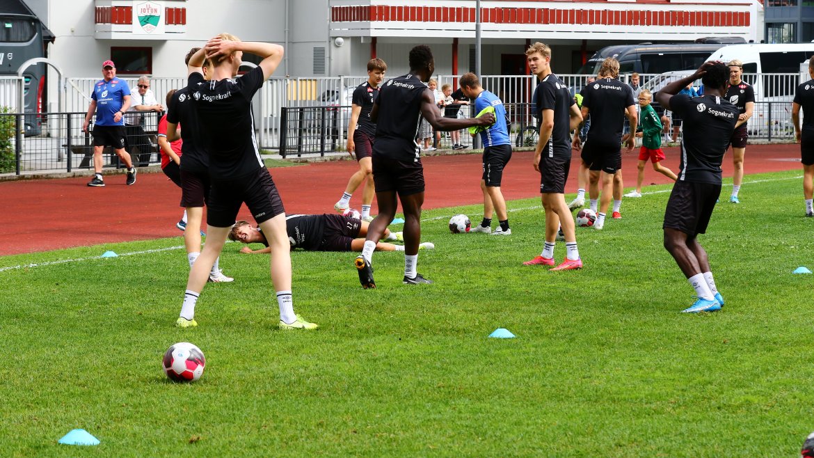 Me er så heldige at me har gode naboar! Henrik Rønningen i IL Jotun stilte opp og lånte bort det flotte anlegget i går (fredag) slik at karane får grastreningar i beina før kampen. Me skal óg trena på gras undervegs i morgon.