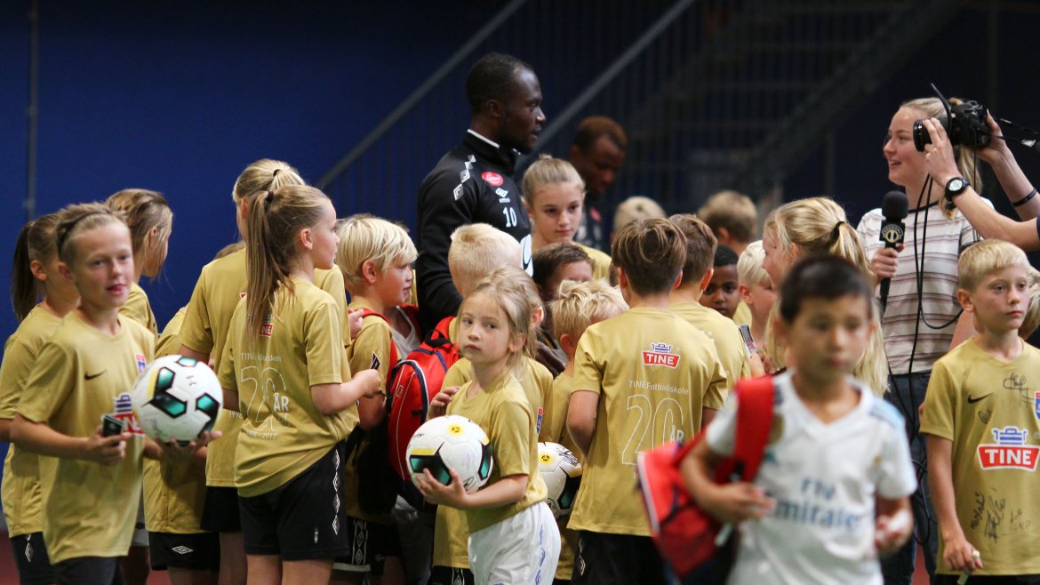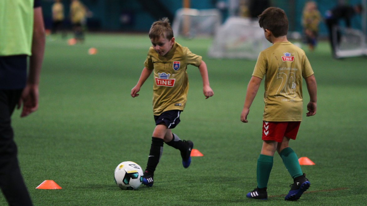 Denne veka er det kring 80 ungar som deltek på Tine Fotballskule. Spelarane er mellom sju og elleve år gamle.