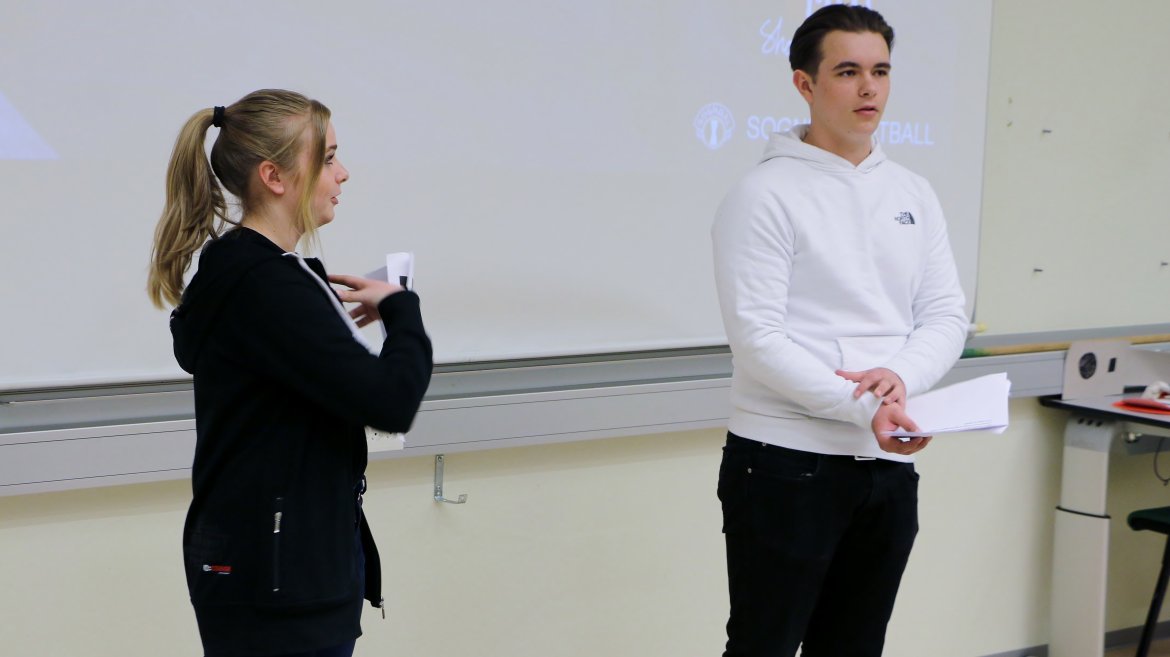 MOT Sogndal sine flotte ambassadørar Vebjørn Abelsen Vik og Tonje Kalvatn Øvretun tok i går turen til Hafslo barne- og ungdomsskule i lag med Per Magnus Steiring, Sigurd Haugen og Rasmus Mo frå Sogndal Fotball.