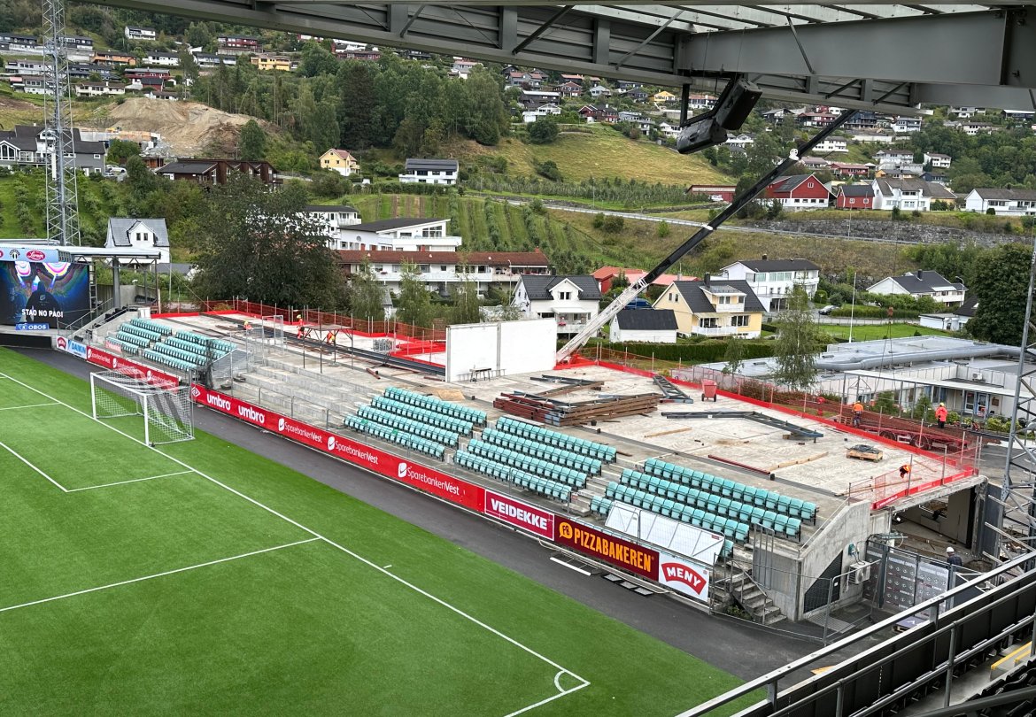 Det har kome nokre spørsmål om selskapet byggjer ny tribune i dette bygget. Det gjer dei ikkje. Det nye bygget er eit reint næringsbygg med eksisterande tribune i front mot bana. Det vil seie at sjølve tribuna blir den same som før, men at bygget bak vil huse nye fasilitetar.