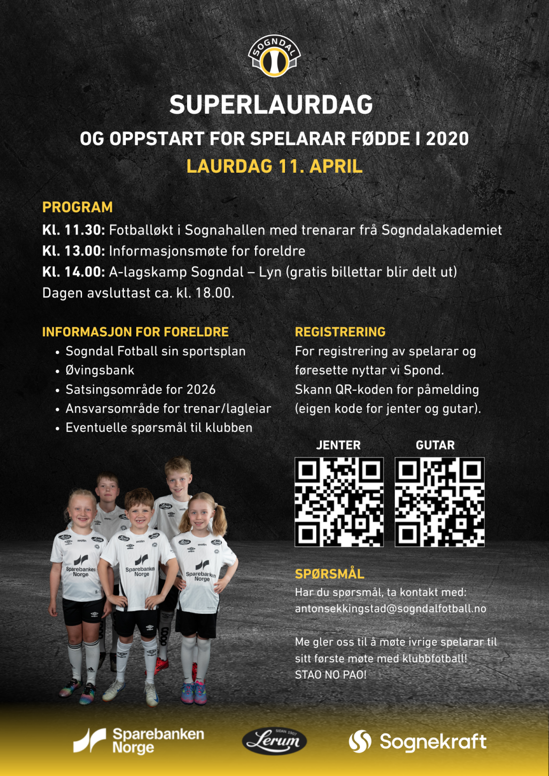 Laurdag 11. april inviterer Sogndal Fotball til Superlaurdag og oppstart for nye spelarar fødde i 2020. Breiddefotballen